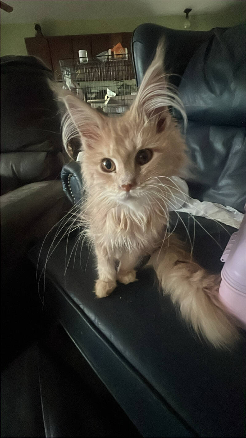 Kai-Lee is a special Maine Coon born with a short tail that curves makes for easy cleaning in hindsight sight